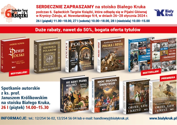 Więcej informacji na stronie: Biały Kruk na 6. Sądeckich Targach Książki w Krynicy-Zdroju – 26-28 stycznia 2024 r. Spotkanie autorskie z ks. prof. Januszem Królikowskim (bialykruk.pl)
