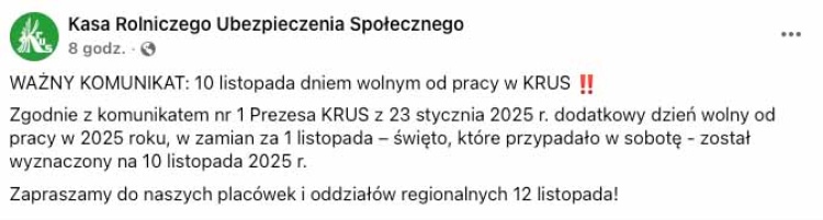 "WAŻNY KOMUNIKAT: 10 listopada dniem wolnym od pracy w KRUS" – przekazano w piątek 7 listopada w komunikacie opublikowanym w mediach społecznościowych KRUS.