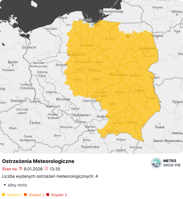 Silny mróz znaczny na północy, w centrum, na wschodzie i południowym wschodzie kraju: stopień 1. Na ogół ostrzeżenia ważne są do godz. 09:00 dnia 10.01, tylko na południu woj. małopolskiego, w woj. podkarpackim i na południu woj. lubelskiego ważne do 11.01